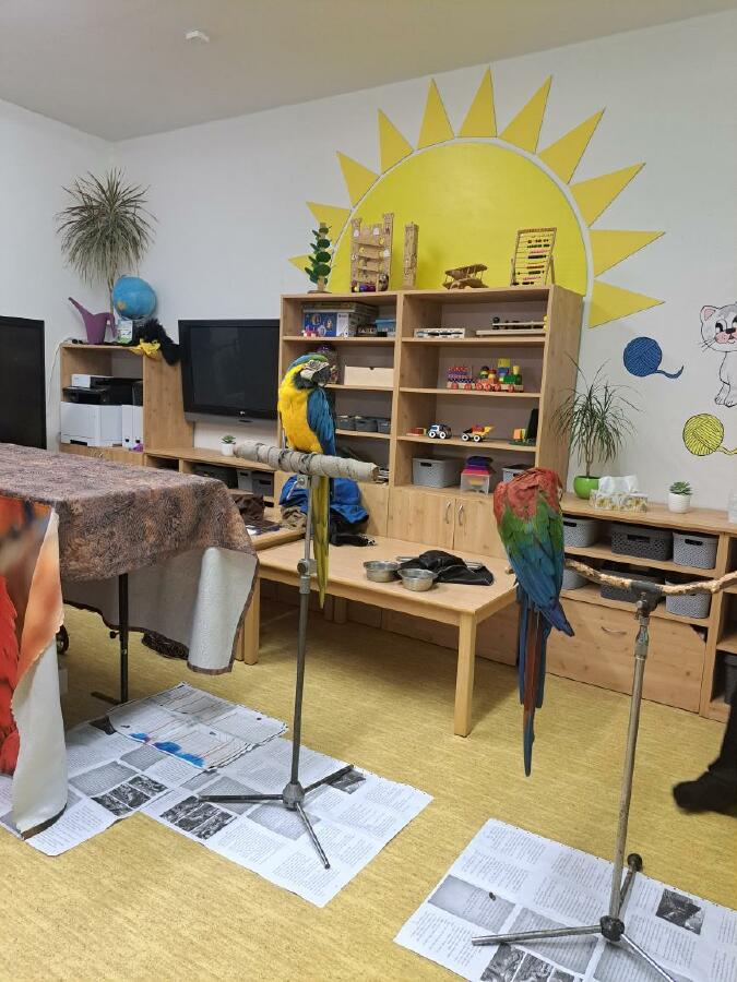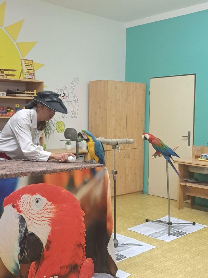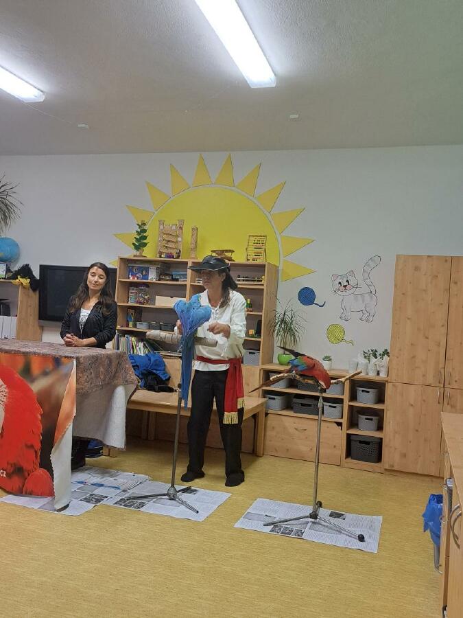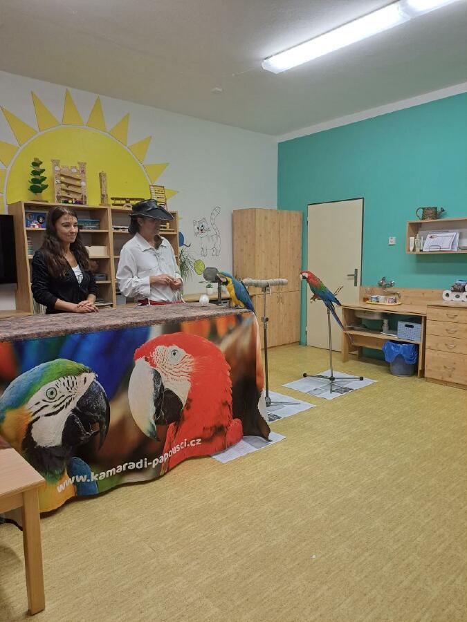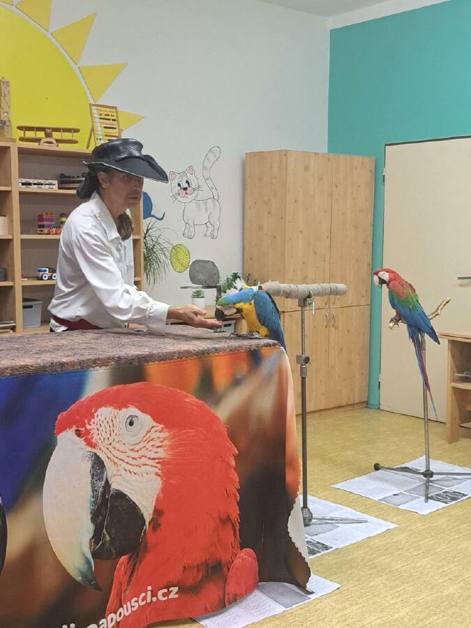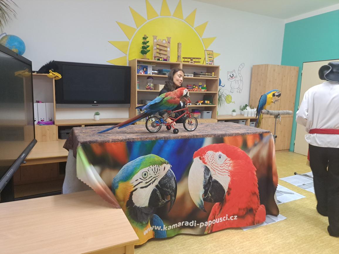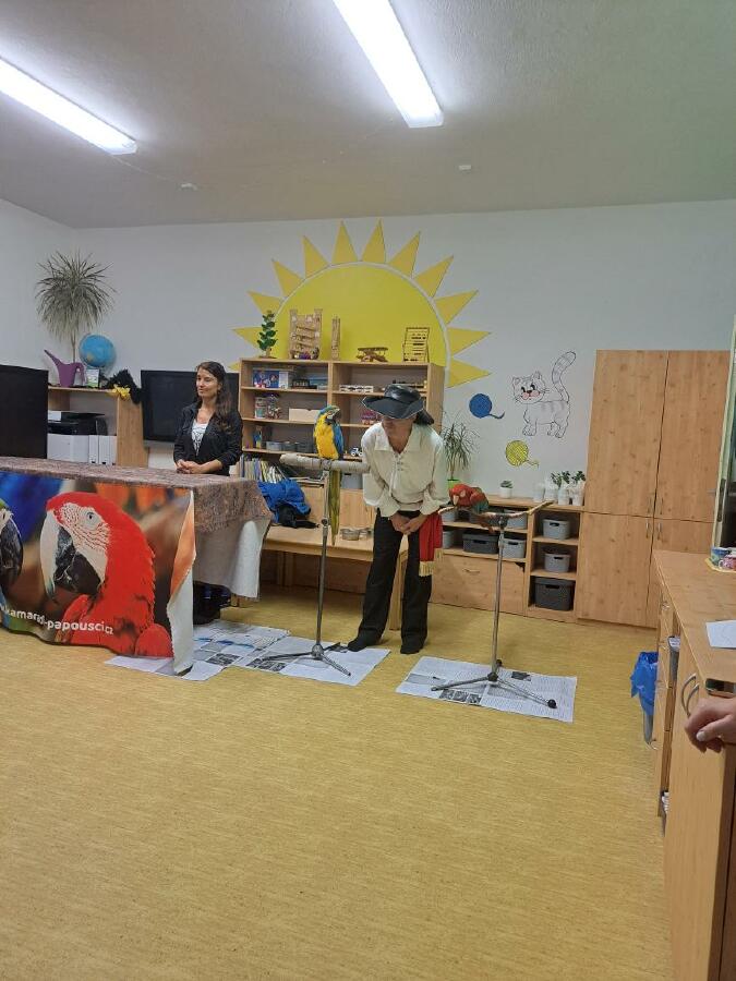 Děti se dozvěděly spoustu informací o životě a chovu papoušků a také nám papoušci předvedli, jak jezdí na kole, nebo umí vyšroubovat šroubek pomocí zobáku a jazyka. Zahráli si basketbal a papoušek Šmudla nám zatančil.